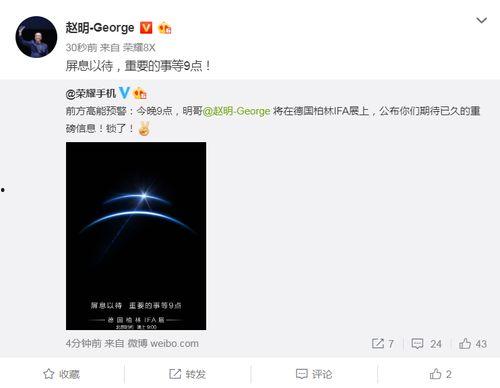 就在前两天,荣耀总裁在微博上放出了一则重磅消息,宣布荣耀即将推出一款全新的旗舰手机。这条微博瞬间吸引了无数网友的关注,大家纷纷猜测这款新品的神秘面纱。